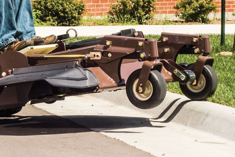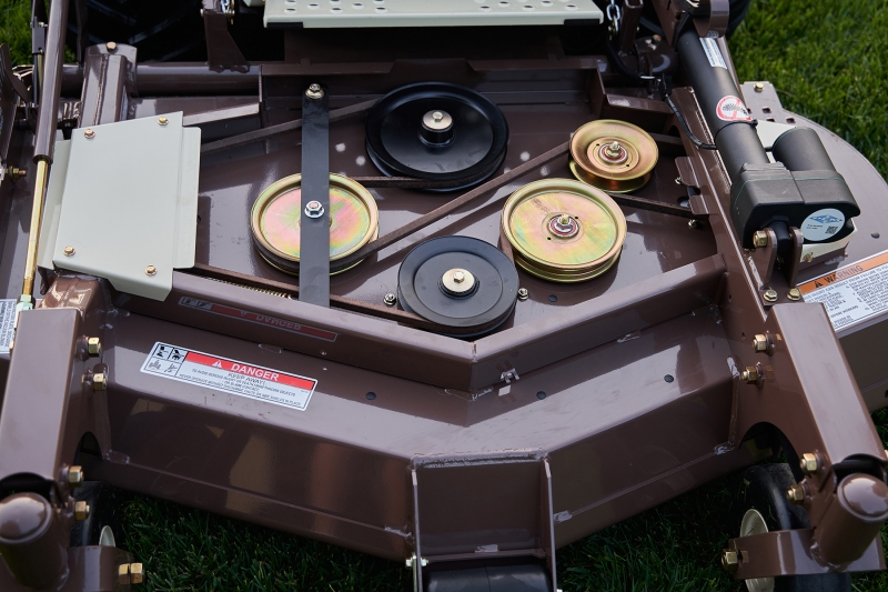 Tubular 2.25 in. x 4 in. boxed members with 0.25 in. gussets. Formed double thickness hardened steel (0.269 in. 7.6% thicker than 0.25 in. (6.35 mm)) truss spindle plane and (3) Sentry™ spindles and a triple-strength upper deck, 1/2 inch thick in stress zones. Geometrically engineered design with 7 gauge skirts to withstand the brunt of commercial mowing.