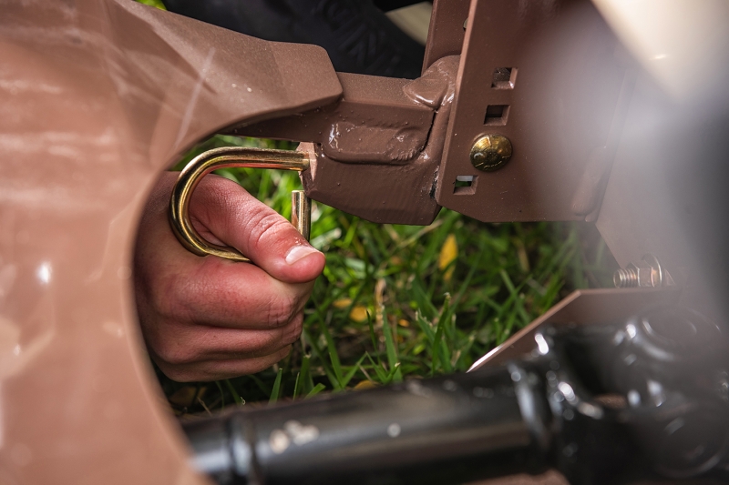 Telescoping PTO shaft with two high-speed U-joints, Quik-D-Tatch® coupler and heavy-duty electric Mag Stop® blade clutch/brake.