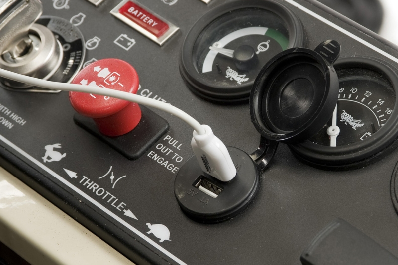 Low engine oil pressure, engine code light and parking brake warning lights, electronic fuel gauge/hour meter, two USB charging ports, work light, ignition and push/pull PTO switches.